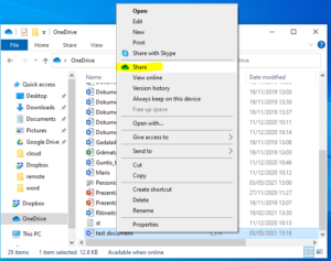 - Щелкните правой кнопкой мыши значок выбранного документа. Выберите команду «Совместно использовать» (Share);
