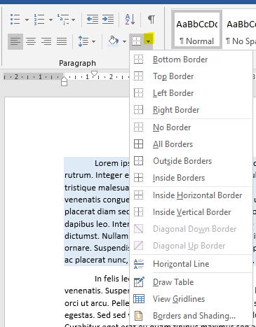 - На вкладке Главная (Home) в группе Абзац (Paragraph) нажмите кнопку на треугольник кнопки Границы (Borders):