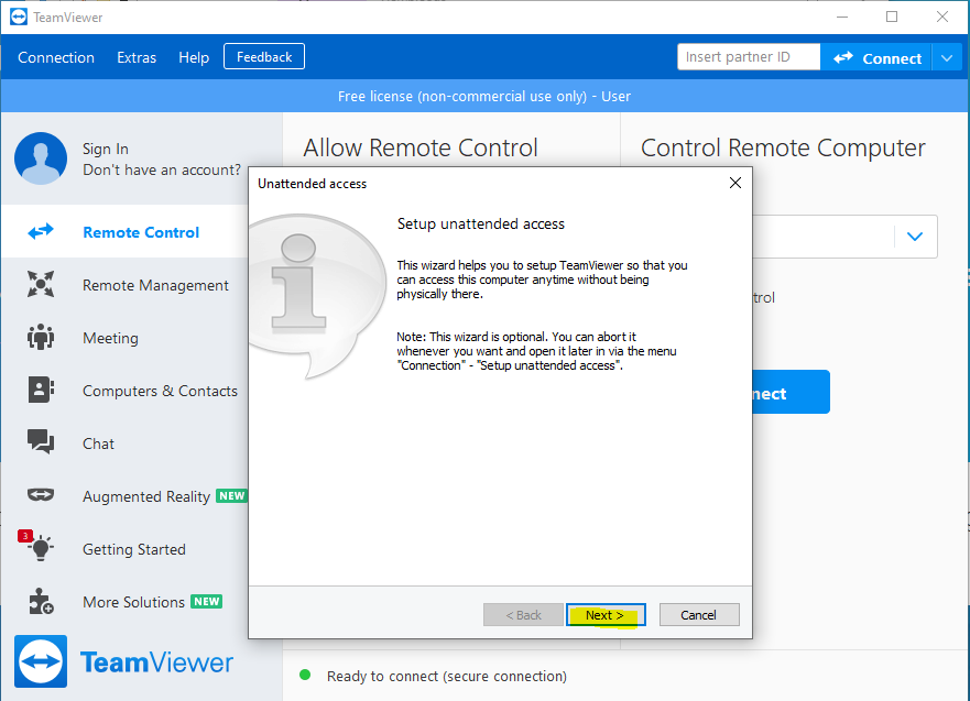 - Если вам не нужно создавать учетную запись пользователя в TeamViewer, выберите вариант Я не хочу создавать учетную запись TeamViewer сейчас (I don’t want to create TeamViewer account now):